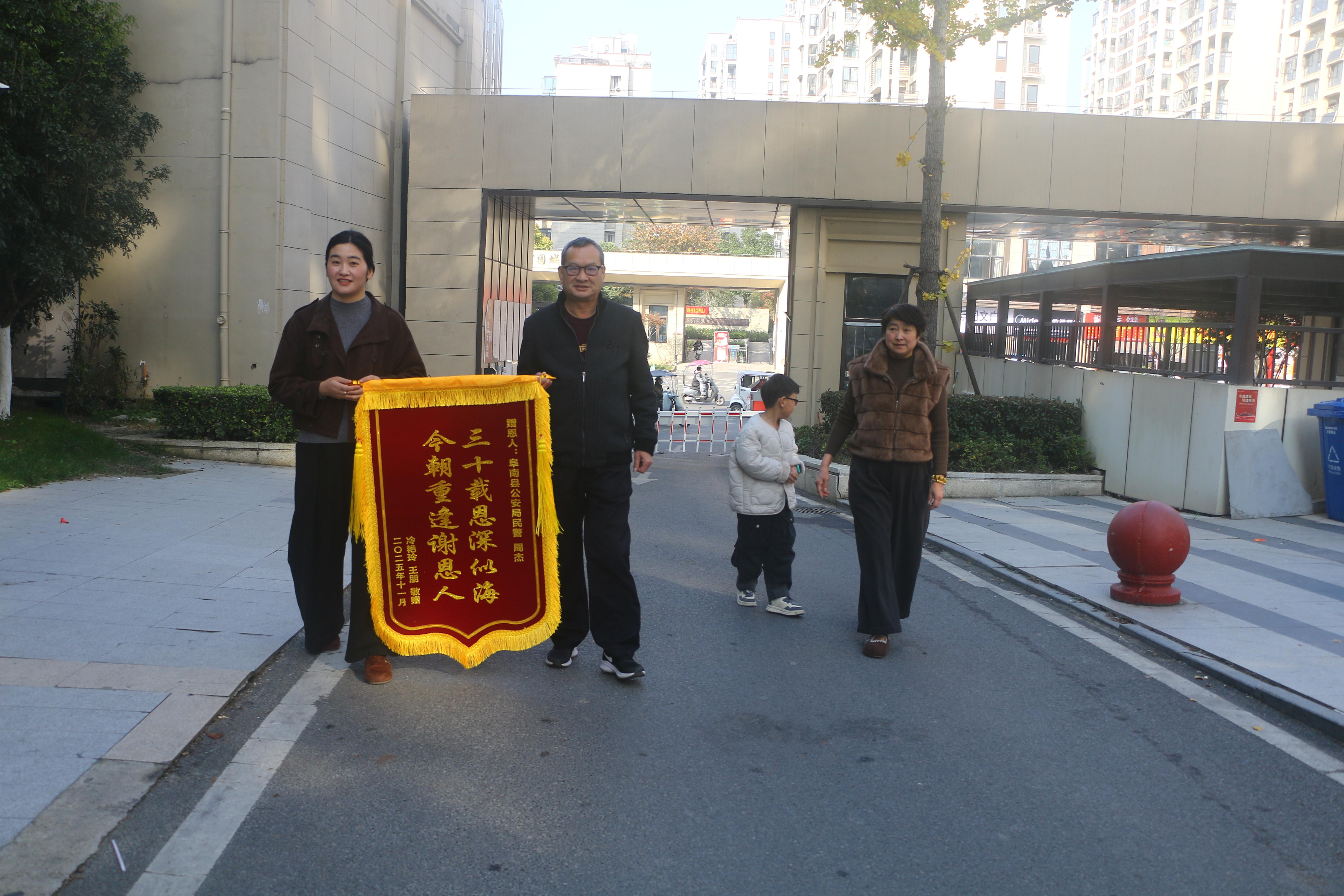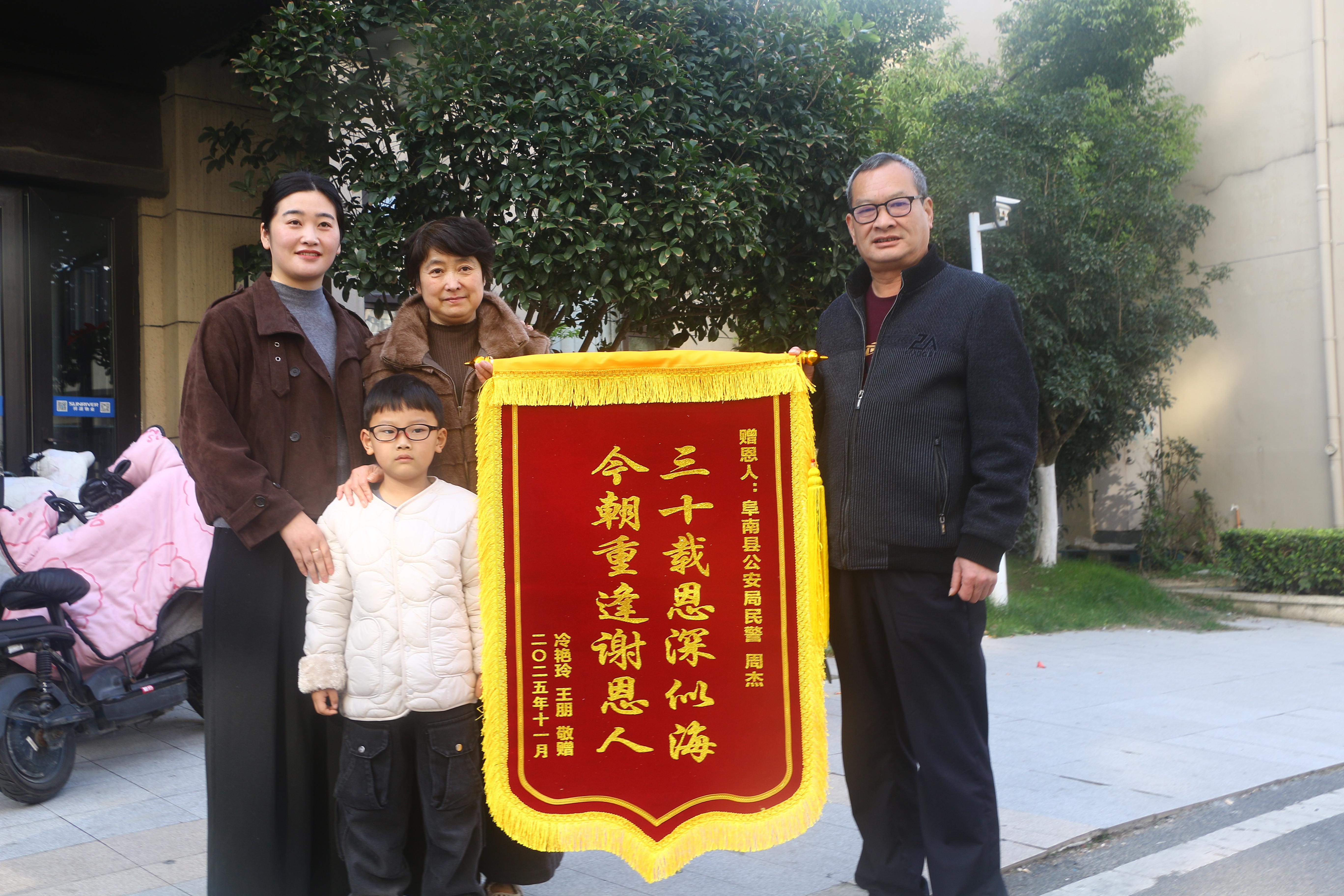 最近几年,冷艳玲在县城一服装内衣店上班,因工作忙抽不开身,于是在几个月前委托表姐王丽打听这个民警的下落。一周前,好消息传来,这个民警找到了,名叫周杰,目前在阜南看守所上班。随后,她赶紧到街上广告公司定做一面写有“三十载恩深似海,今朝重逢谢恩人”的锦旗,当地面感谢民警周杰。