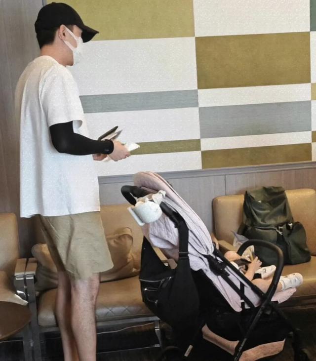 整个场景中最引人注目的,是他身前那辆亮黄色的婴儿车,胡歌全程亲自推着车子,动作自然熟练,据爆料,婴儿车里坐着的正是他两岁的大女儿,他时而俯身照看,注意力大多集中在孩子身上,显得专注而温柔。